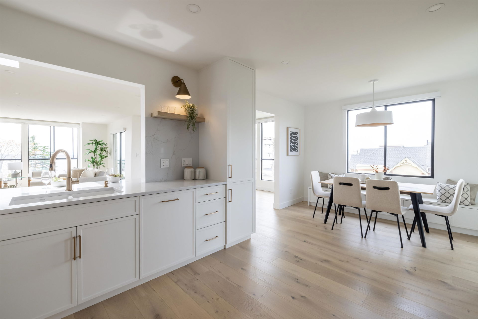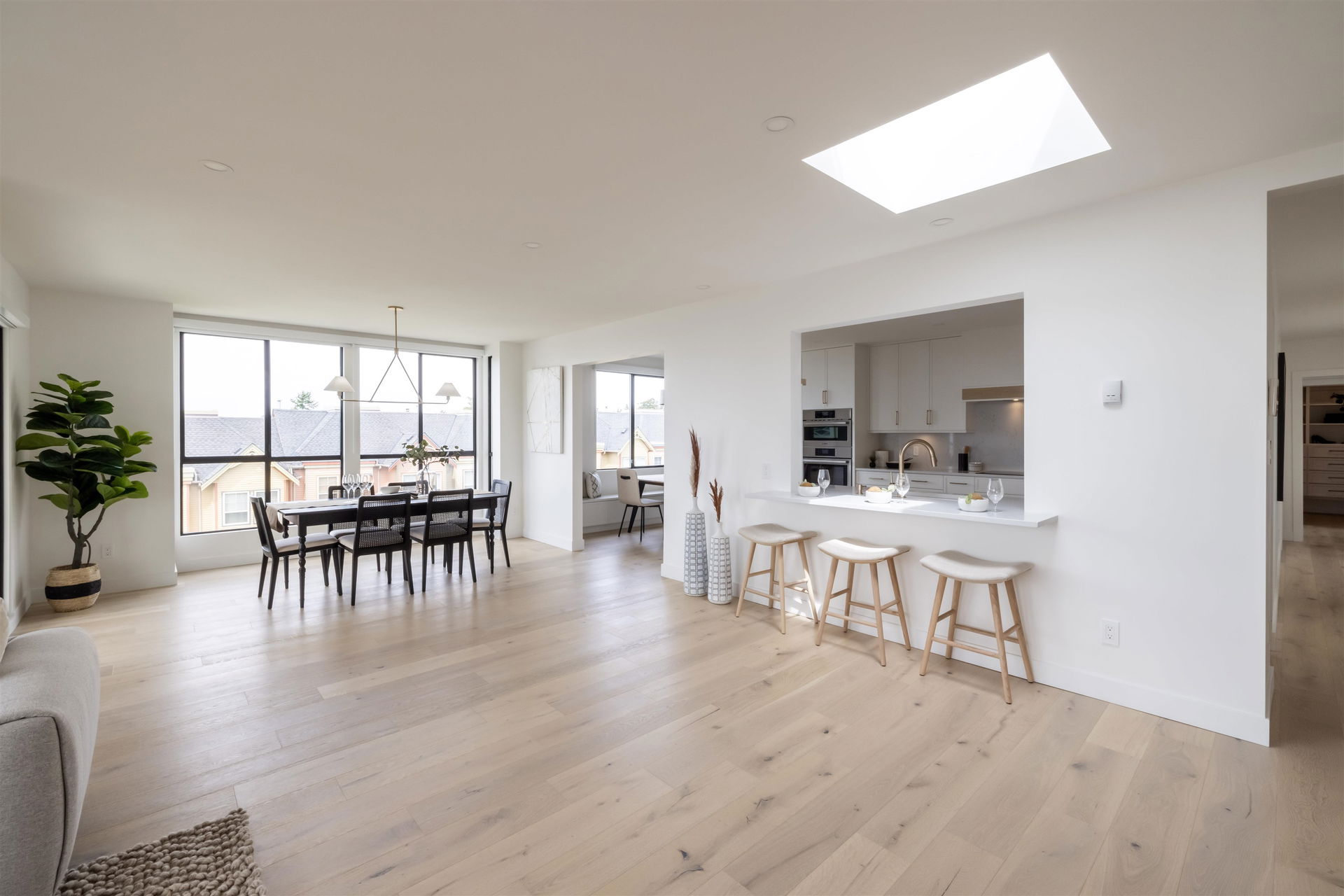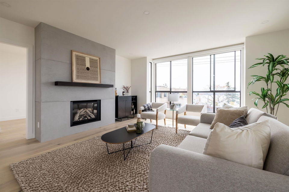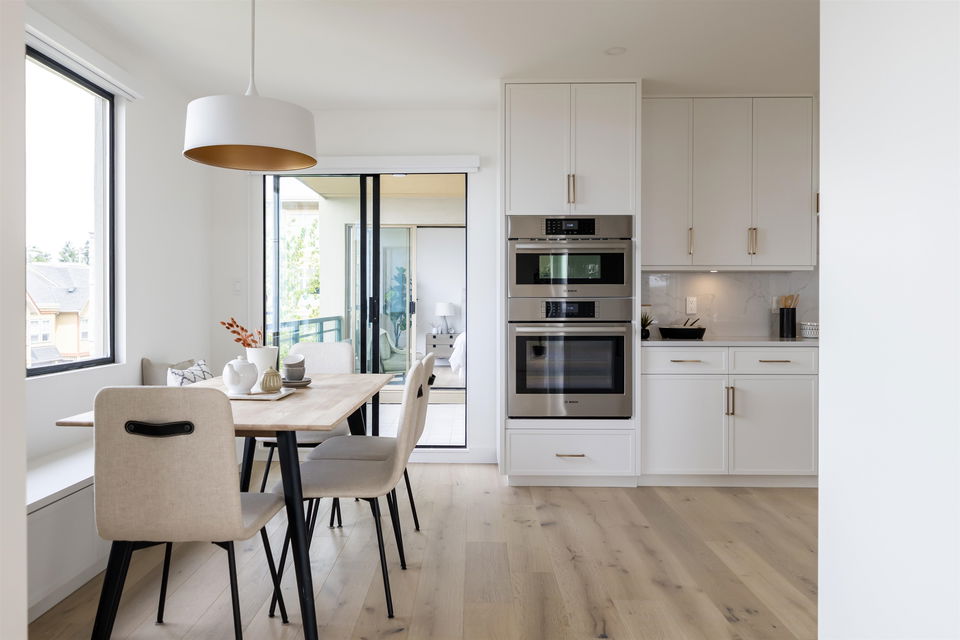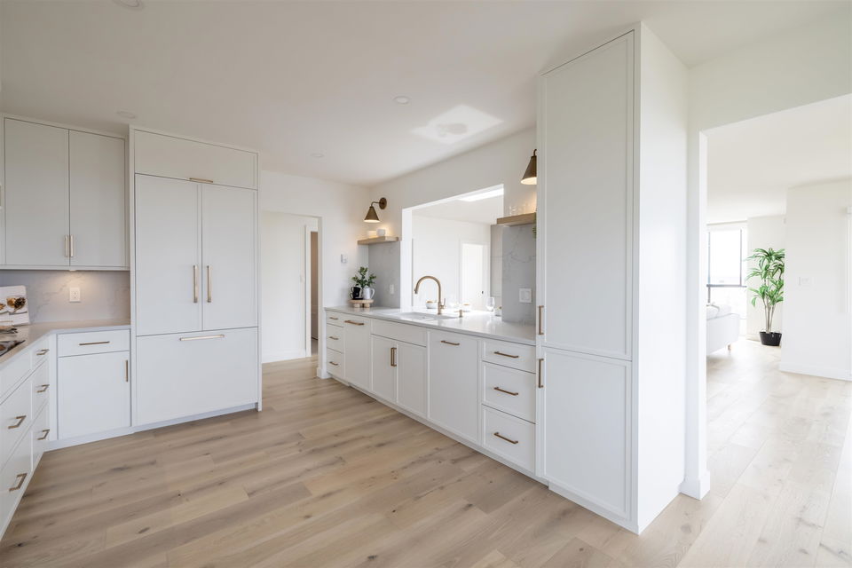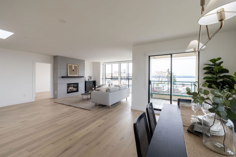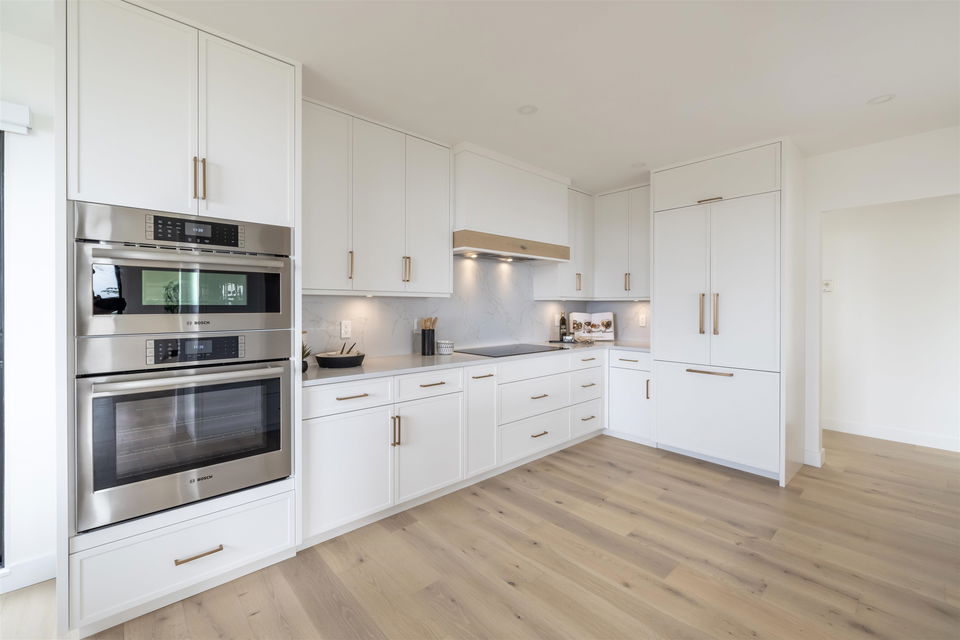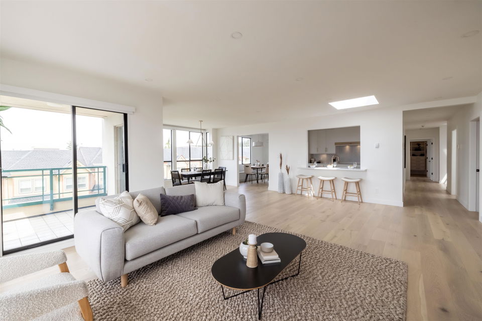 Oceanview Penthouse on Five Corners! A nearly 2,100sqft penthouse condo in a low rise concrete building, panoramic ocean views and no expense spared on this stunning renovation. An absolute masterpiece sure to appease up-sizers, down-sizers and even the most discerning of buyers alike. This spectacular home boasts BREATHTAKING SOUTHWEST OCEAN VIEWS from almost every oversized room in the home, opulent finishes throughout, cabinet faced Bosch appliances, huge master ensuite w/ heated floors and oversized W/I shower, builtins in every closet and so much more! 3 bedrooms, 2 baths, 2 parking stalls, a storage locker and tons of storage space. Rarely do homes of the caliber become available all within walking distance of all your everyday amenities. You will not be disappointed, COME SEE!